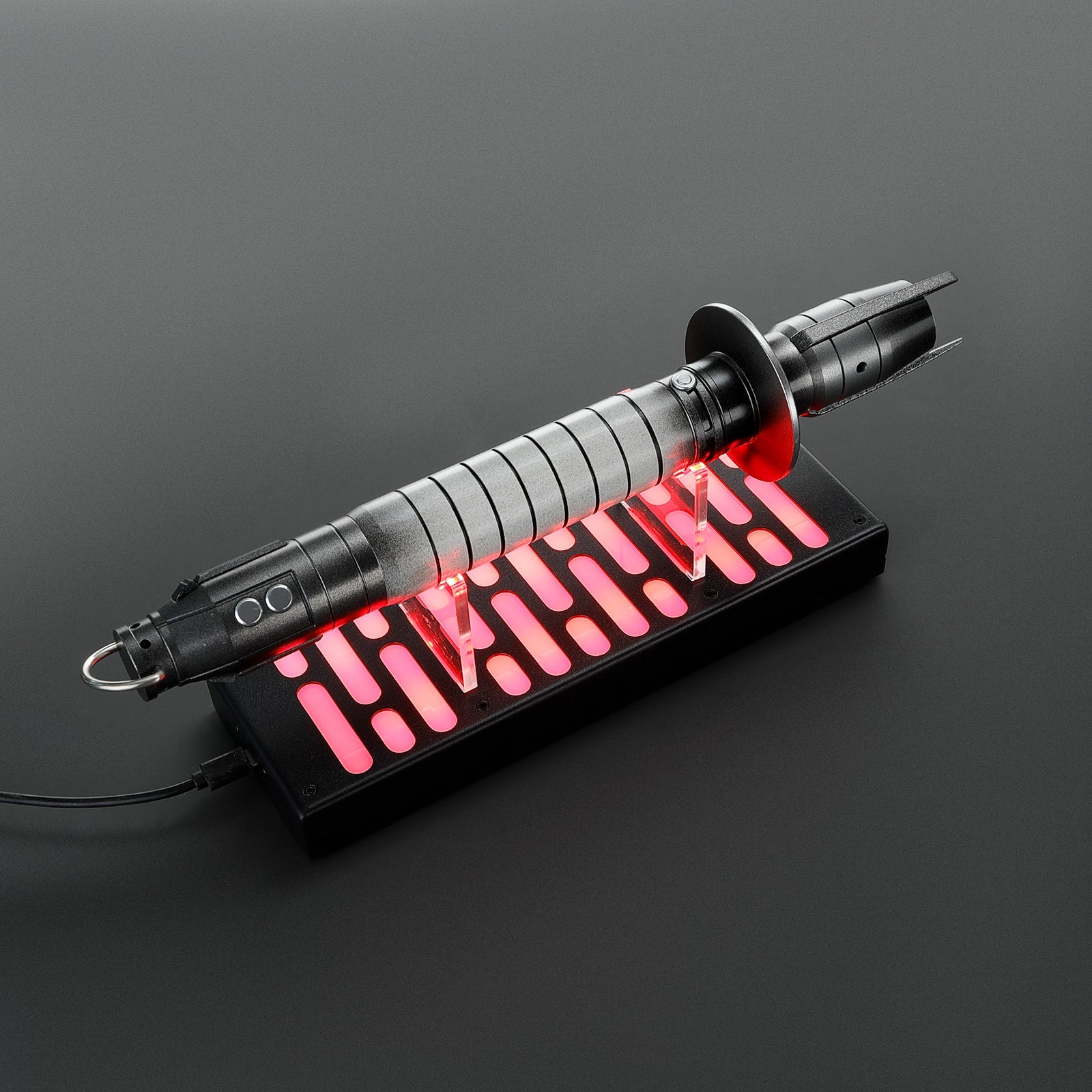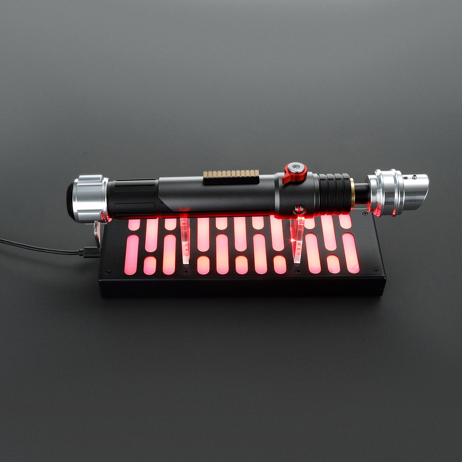 Enhance your collection with this Imperial LED Saber Stand, designed to add a touch of excitement and sophistication. Crafted from premium acrylic, this three-tier hilt holder beautifully showcases your lightsaber hilts, creating a striking and dynamic display.